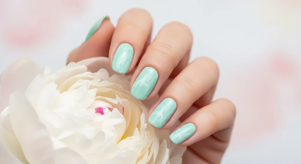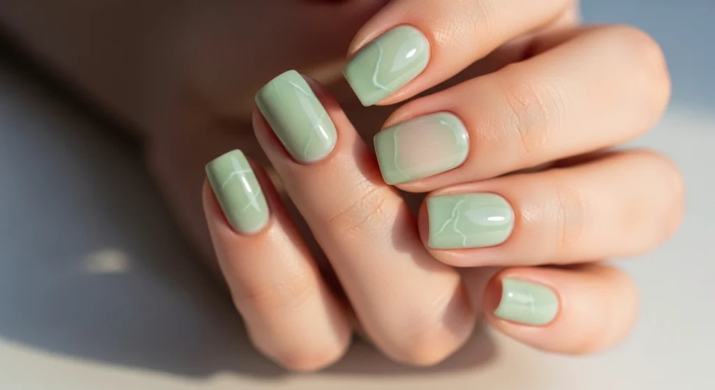 The softest, most wearable version — pale minty jade with faint veining on neat oval nails. Feminine, fresh, and perfect for everyday.