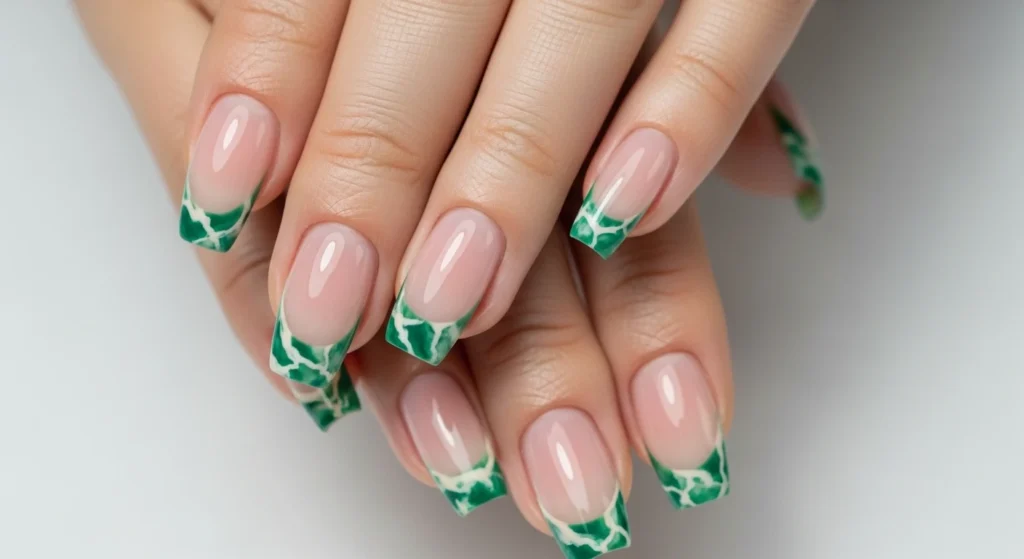 Nude pink base with jade marble only on the tips. Office-friendly, date-night-ready, and the easiest way to dip your toes (well, fingers) into the trend.