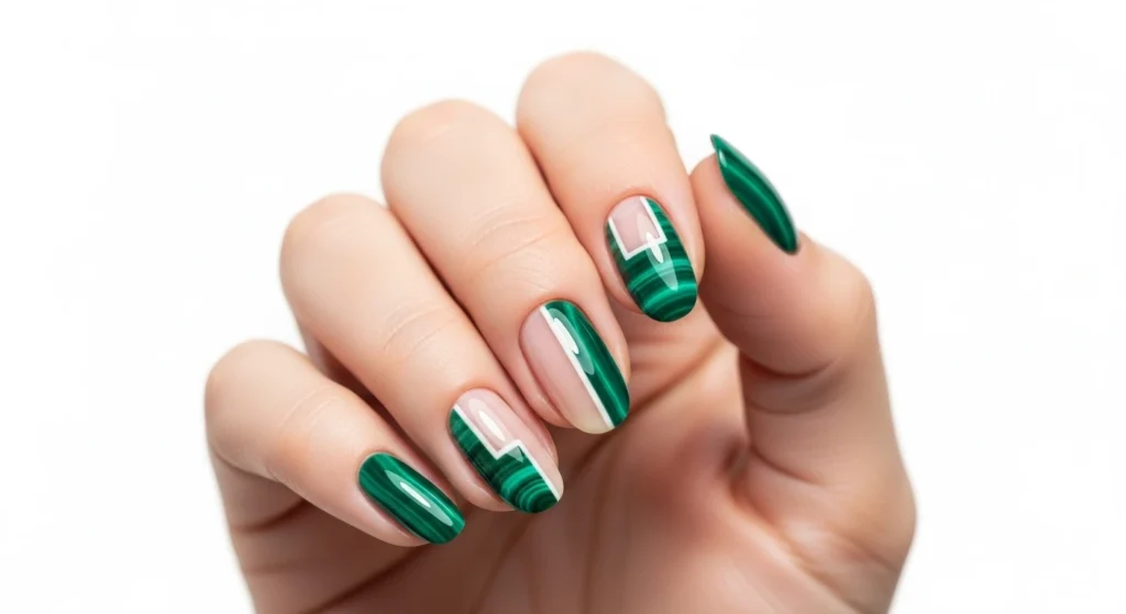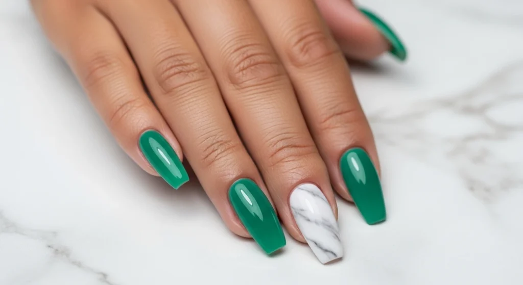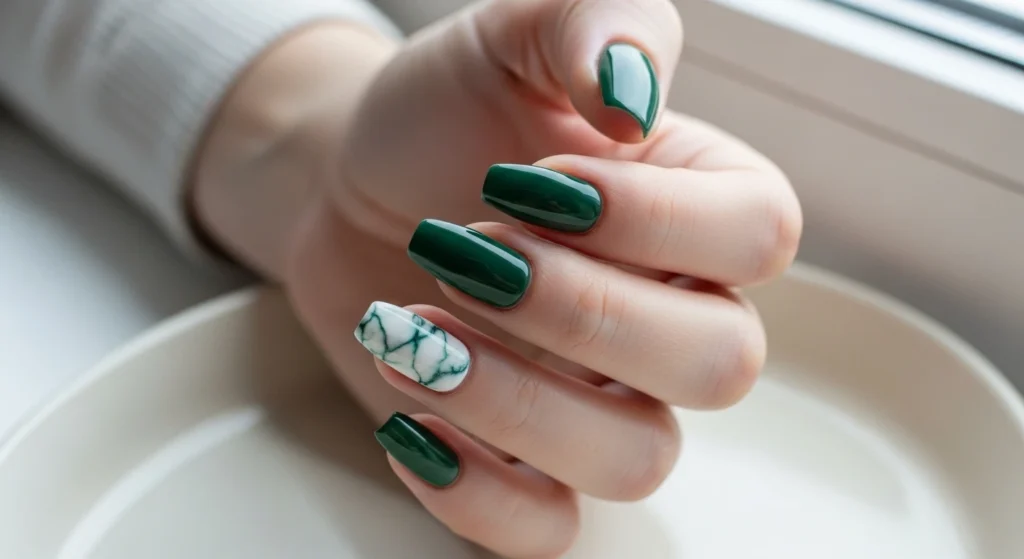 Three nails in solid deep forest green, two in jade marble. Gives you the marble moment without overwhelming the whole hand.