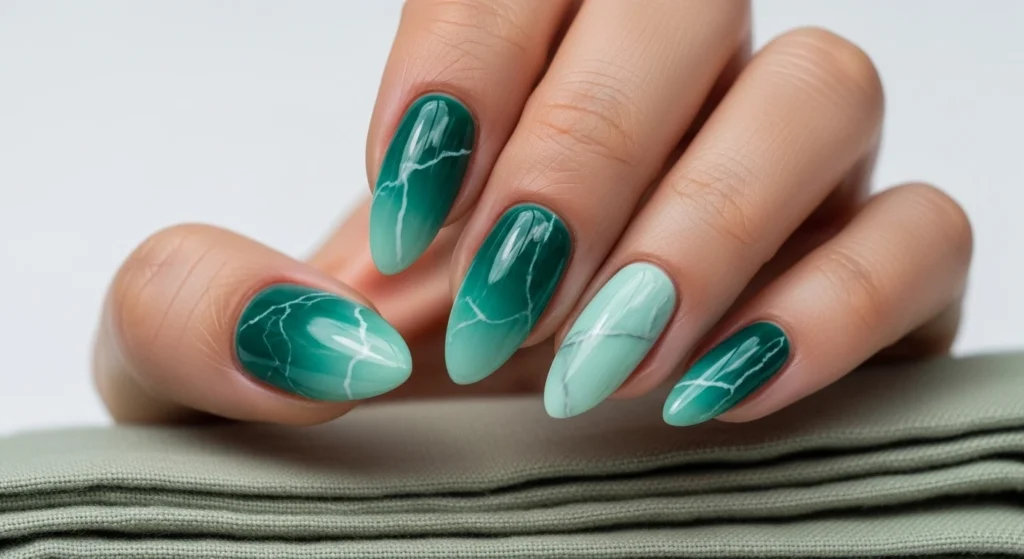 Deep jade at the base melting into pale seafoam at the tips, with marble veins running throughout. Gradient + marble = nail art perfection.
