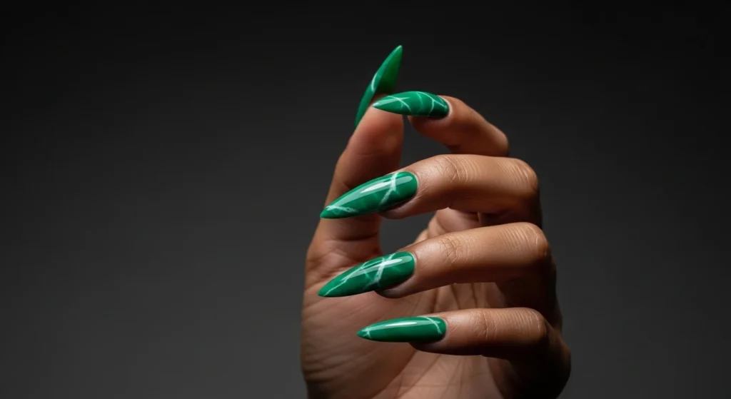 The same jade marble but on sharp stiletto shapes. Everything looks more dramatic on a stiletto — and this green is no exception.
